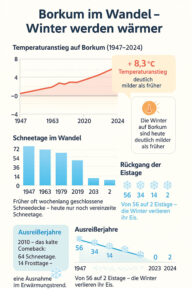 „Die Entwicklung verläuft aber nicht direkt linear“, erklärt Marc Wenthe. Vielmehr gibt es auch bei einem sich erwärmenden Weltklima bzw. bei der globalen Erwärmung immer wieder auch mal kalte und warme Jahre – und Ausreißer nach oben oder nach unten.“ Ein gutes Beispiel dafür sei das Jahr 2010, als plötzlich wieder an 64 Tagen Schnee lag und 14 Tage Dauerfrost herrschten. „Die Daten zeigen trotz solcher Ausreißer jedoch einen klaren Erwärmungstrend, der weniger Eistage und seltenere Schneefälle auf Borkum mit sich bringt“, fasst Wenthe zusammen.