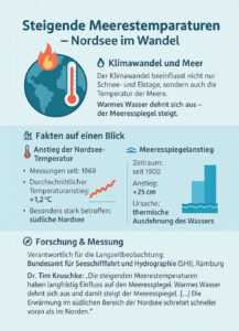 Der Klimawandel hat jedoch nicht nur Auswirkungen auf die Schneetage – sondern letztendlich auch auf die Meerestemperatur. „Die steigenden Meerestemperaturen haben langfristig einen Einfluss auf den Meeresspiegel. Warmes Wasser dehnt sich aus und damit steigt der Meeresspiegel. Entlang der deutschen Nordseeküste ist der Meeresspiegel seit dem Jahr 1900 bereits um gut 25 cm gestiegen, das lässt sich mit Messdaten zeigen. Es gibt aber keinen direkten Einfluss des steigenden Meeresspiegels auf die Temperatur“, erklärt Dr. Tim Kruschke, Referatsleiter Marine Klimafragen beim Bundesamt für Seeschifffahrt und Hydrographie (BSH) in Hamburg. „Am Bundesamt für Seeschifffahrt und Hydrographie wird die Oberflächentemperatur der Nordsee bereits seit 1969 analysiert. Im Mittel über das gesamte Kalenderjahr und die komplette Fläche der Nordsee messen wir hier einen Anstieg der Mitteltemperatur um ca. 1,2 °C seit 1969. Dabei ist zu beobachten, dass die Erwärmung im südlichen Bereich der Nordsee schneller voranschreitet als im Norden.“