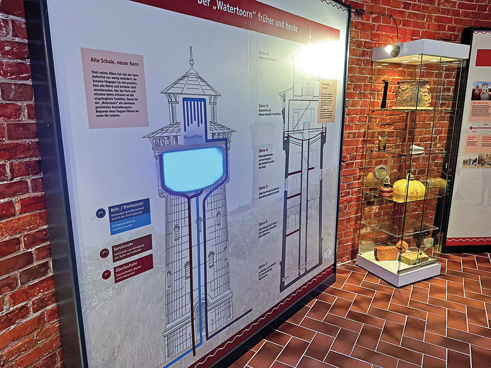 Seit dem 1. April 2023 ist „Das Borkumer Watermuseum“ für die Öffentlichkeit zugänglich, die sich hier fortan auf ein ausgereiftes Ausstellungskonzept freuen kann. Während dabei beispielsweise die Wasserwerkstatt im Waterhuus Kleingruppen die Möglichkeit bietet, mit pädagogischen Mitteln wichtiges Grundwissen zu erfahren, erwartet Besucher im Wasserturm auf sechs Ebenen eine interessante Ausstellung, die mittels moderner Medien und innovativer Exponate alles Wissenswerte rund um die Trinkwasserversorgung auf Borkum vermittelt. Auf dem Gelände des Watermuseums wurden zudem verschiedene Stationen geschaffen, an denen nicht nur Kinder das Element Wasser und seine Eigenschaften spielerisch erforschen und begreifen können.