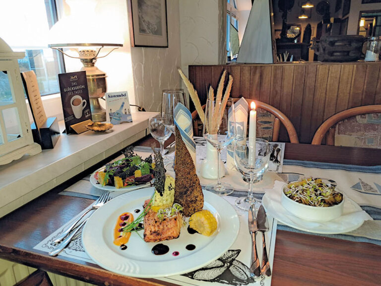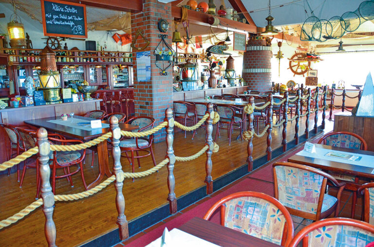 Küchenchef Andy Bonea hat dabei ein sicheres Händchen für die Kunst, etwas Schönes anzurichten. Eine große Palette an Fischgerichten und eine verlockende Vielzahl an Fleischgerichten bietet er an. Die Seezunge ist für Fischliebhaber genauso begehrt wie das Rumpsteak Strindberg für den Freund saftiger Steaks. Und in der kalten Jahreszeit sind die Angebote an köstlichem Grünkohl oder dem berühmten Borkumer Salzfleisch ein Genuss. Besonders bei Sonnenschein in der warmen Jahreszeit sind die Plätze auf der Terrasse bei den Gästen sehr beliebt. Von hier bietet sich bei Kaffee und Kuchen ein unvergleichlich schöner Blick über das Watt, hinüber nach Holland.